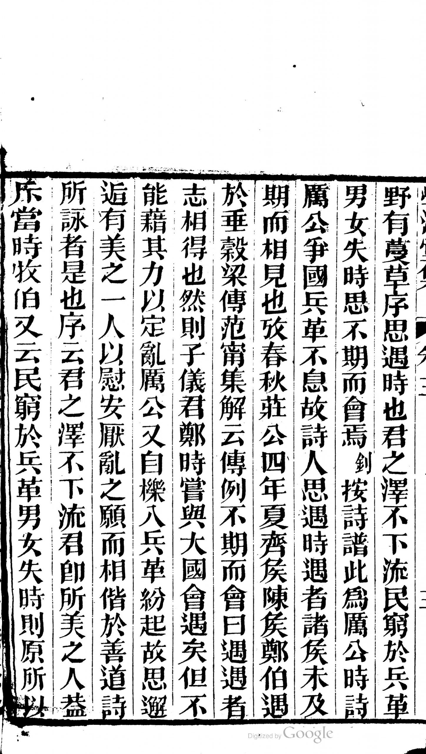 〈野有蔓草序〉:「思遇時也。君之澤不下流,民窮於兵革,男女失時,思不期而會焉」。按:《詩譜》:「此為厲公時詩,厲公爭國,兵革不息,故詩人思遇時。」遇者,諸矦未及期而相見也。攷《春秋.莊公四年》「夏,矦、矦、伯遇於垂」,《穀梁傳》范甯《集解》云:「傳例,不期而會曰遇。遇者,志相得也。」然則子儀時,嘗與大國會遇矣,但不能藉其力以定亂,厲公又自入,兵革紛起,故思邂逅有美之一人,以慰安厭亂之願,而相偕於善道,《詩》所詠者是也。〈序〉云「君之澤不下流」,君即所美之人,蓋斥當時牧伯;又云「民窮於兵革,男女失時」,則原所以